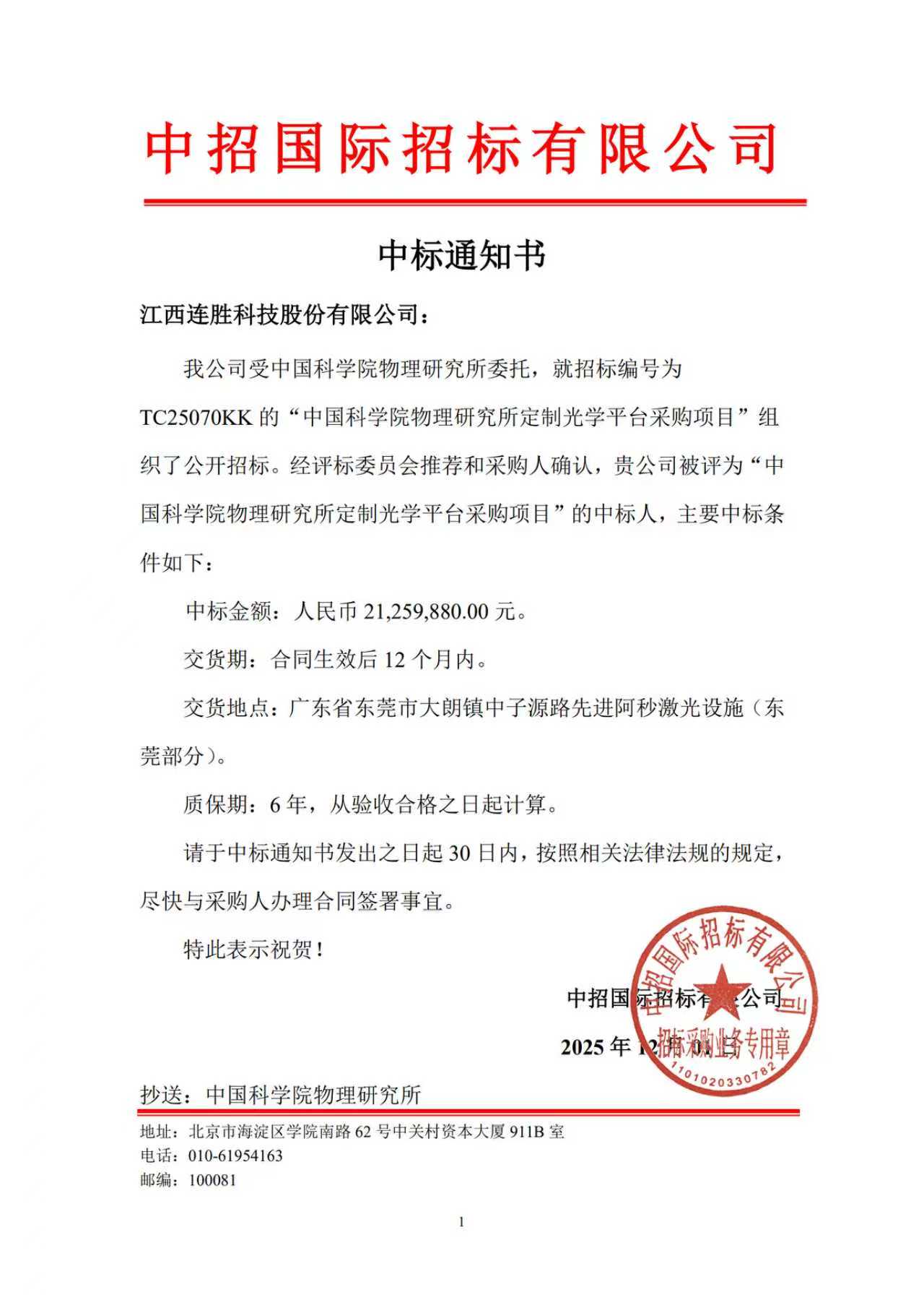 此次中标不仅是企业技术能力的验证,也为后续在光学领域深化布局、服务科研创新注入动力。江西连胜科技股份有限公司将以此为契机,持续深耕光学技术赛道,为行业技术升级与科研突破贡献专业力量。